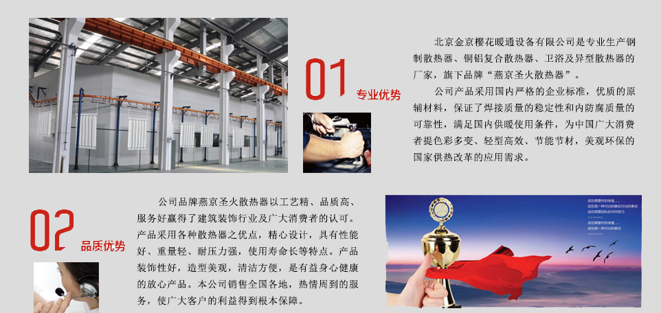 公司自成立以来,一直以改善消费者家居生活品质为目标,始终致力于新型采暖设备的研发和制造,推行全面科学的管理,产品涵括铜铝散热器,钢铝散热器、钢制散热器、卫浴散热器、艺术散热器等,形成完整的产品销售链和服务链。